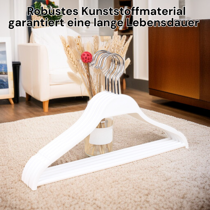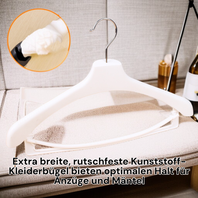 ● Extra breite, rutschfeste Kunststoff-Kleiderbügel bieten optimalen Halt für Anzüge und Mäntel, verhindern zuverlässig das Abrutschen und Verformen Ihrer Kleidung.